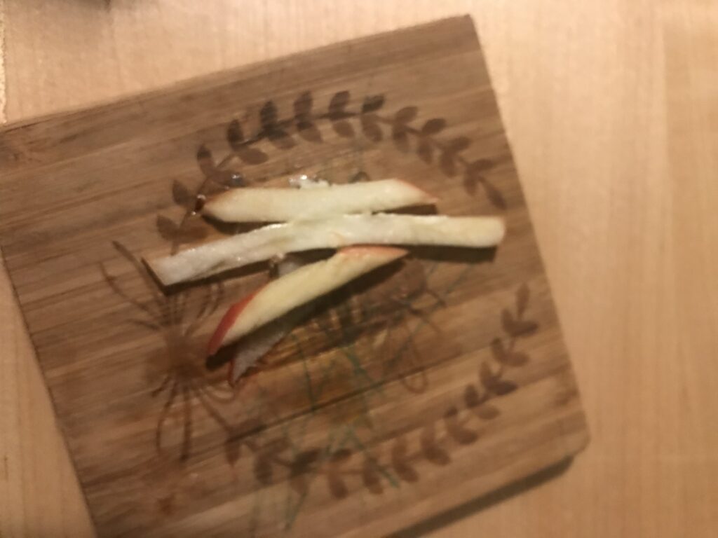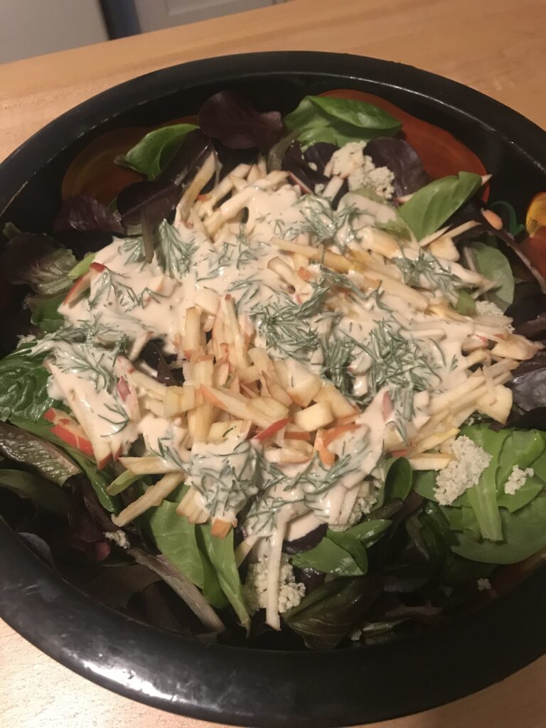 I scraped paint until I realized I was super hungry. I looked at the clock and it was 7pm. Wow, time flew by. I cleaned up. Then I made a big salad with lettuce, pumpkin seed cheese and apple. Then I made some homemade tahini dressing with raw tahini, fresh lime juice, fresh dill, fresh garlic and water. Angel had some apple “French fries”, avocado and coconut for dinner.
