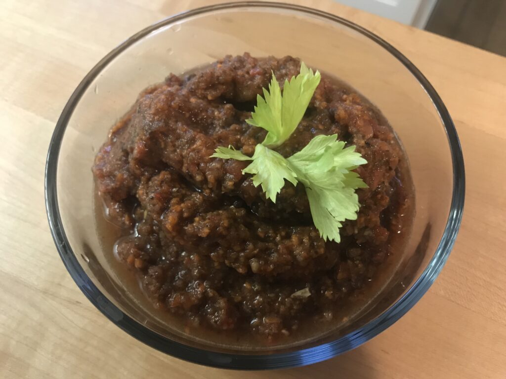 Tools: -food processor with S blade. -cutting board. -sharp knife. – large mixing bowl. – stirring spatula or large spoon. Ingredients:-8 medium sized tomatoes. -3 stalks of celery. -6 medium carrots. -4 portobello mushrooms. -1 tablespoon lime juice. -1 clove of garlic. -1 teaspoon chipotle chili powder. -1 tablespoon cumin. Instructions: cut tomatoes into chunks and put 1/2 of them into the food processor. Pulse until chunky. Pour them into a large mixing bowl. Do the same with the other half of the tomatoes. Next cut the mushrooms into chunks and put them into the food processor. Add the lime juice, garlic, chipotle chili power and cumin. Pulse until they are in small pieces like hamburger. Pour them into the mixing bowl with the tomatoes. Next put the celery and carrots into the food processor. Turn on until they are chopped into very small pieces. Scrape them out with a spatula into the mixing bowl with the other ingredients. Mix all the ingredient together with a spatula or a spoon. Pour into soup bowls, garnish with celery leaves for the fun of it and serve. Enjoy!