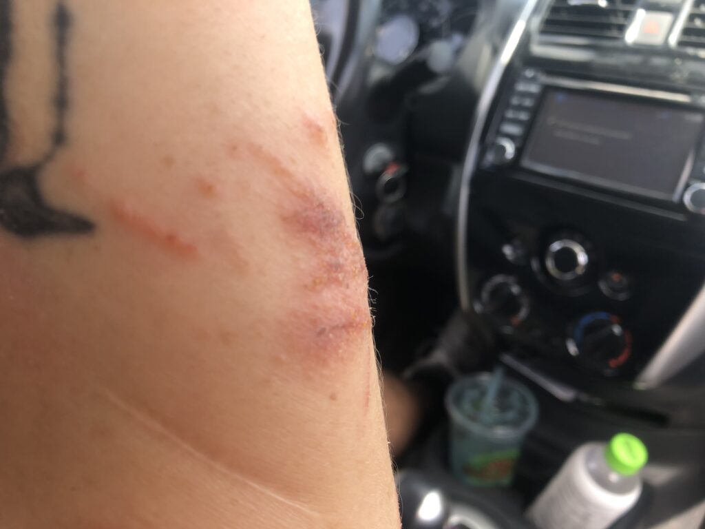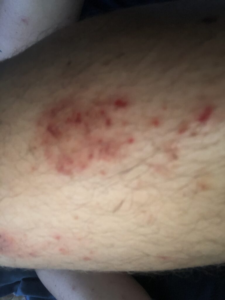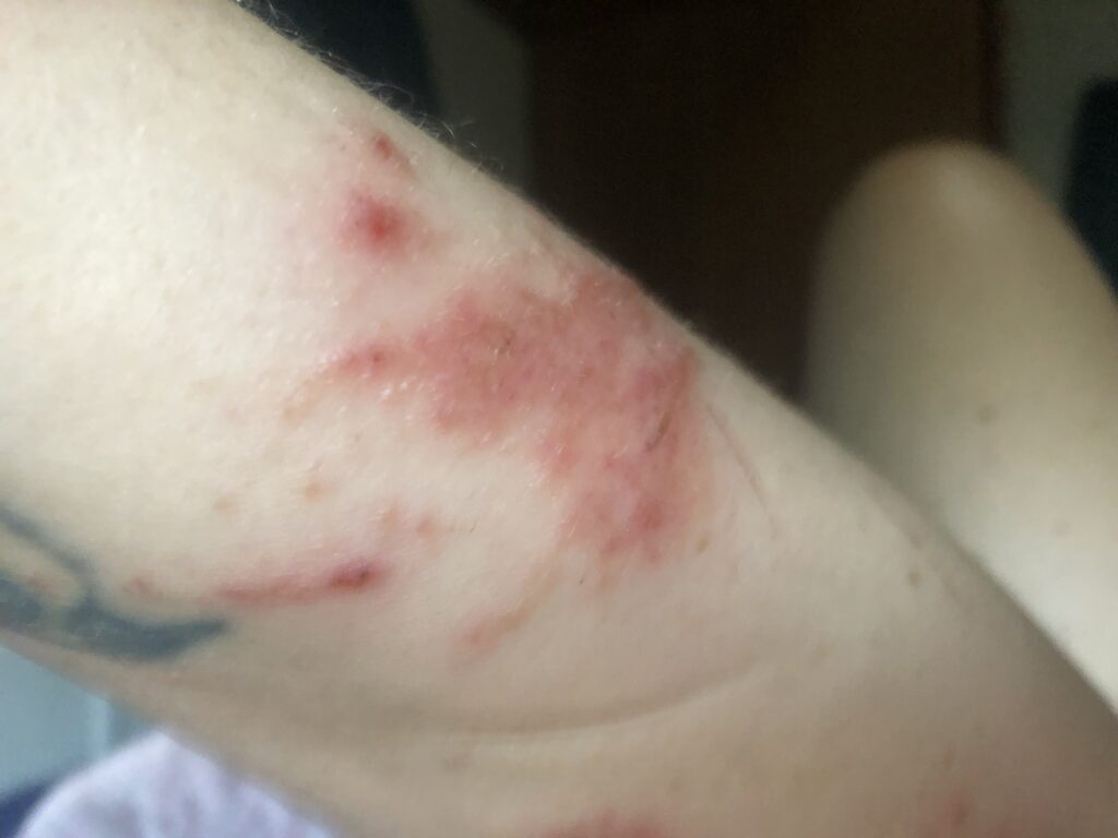 At the minute clinic (which took about 3 hours to get into) I was diagnosed with scabies. Scabies are a mite that are too small to see. They are usually passed from human contact but can be transferred from clothing or bedding. They burrow under the skin and lay eggs. Usually they are in between the fingers, in armpits or creases. Mine were all over. NP didn’t do a lab test but said the burrows made it pretty obvious that it was scabies.