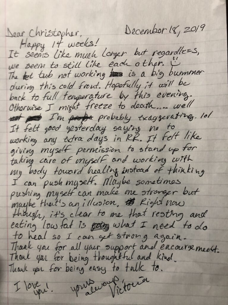 It felt good yesterday saying no to working any extra days in RR. It felt like giving myself permission to stand up for myself and work with my body toward healing instead of thinking I can push myself. Maybe sometimes pushing myself can make me stronger but maybe that’s an illusion. Right now though, it’s clear to me that resting and eating low fat is what I need to heal so I can get strong again.